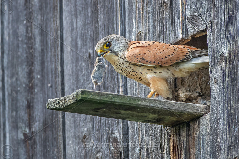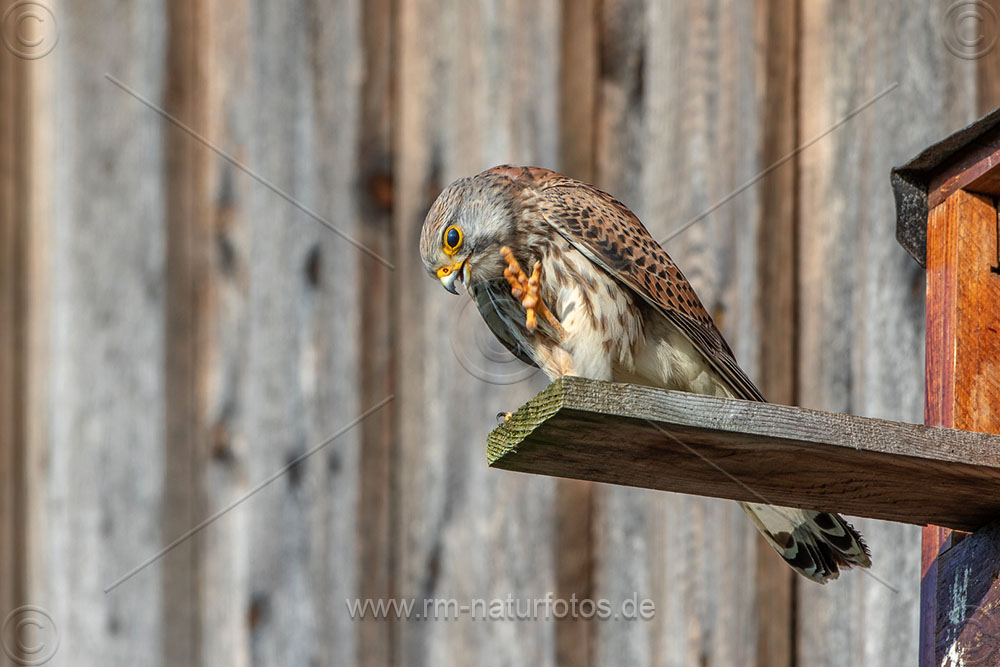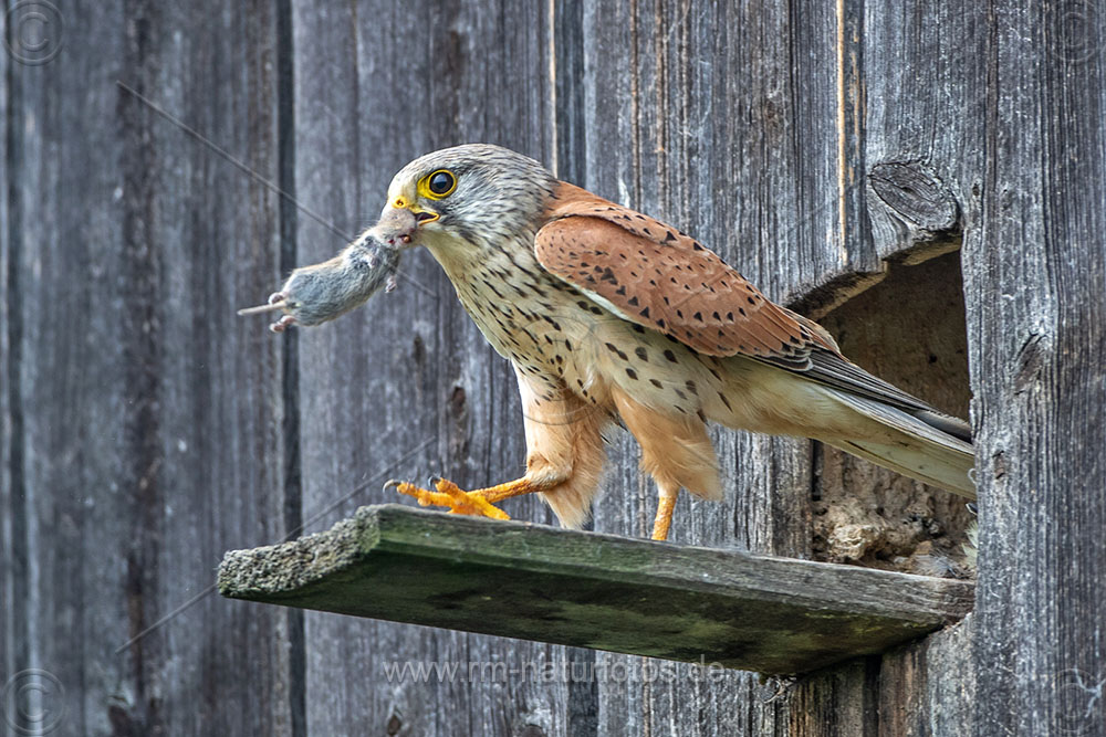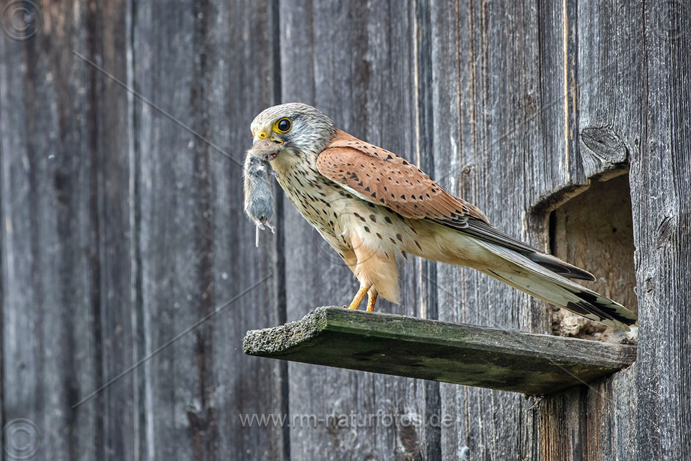 Turmfalke (Falco tinnunculus) Männchen mit Maus am Nistkasten