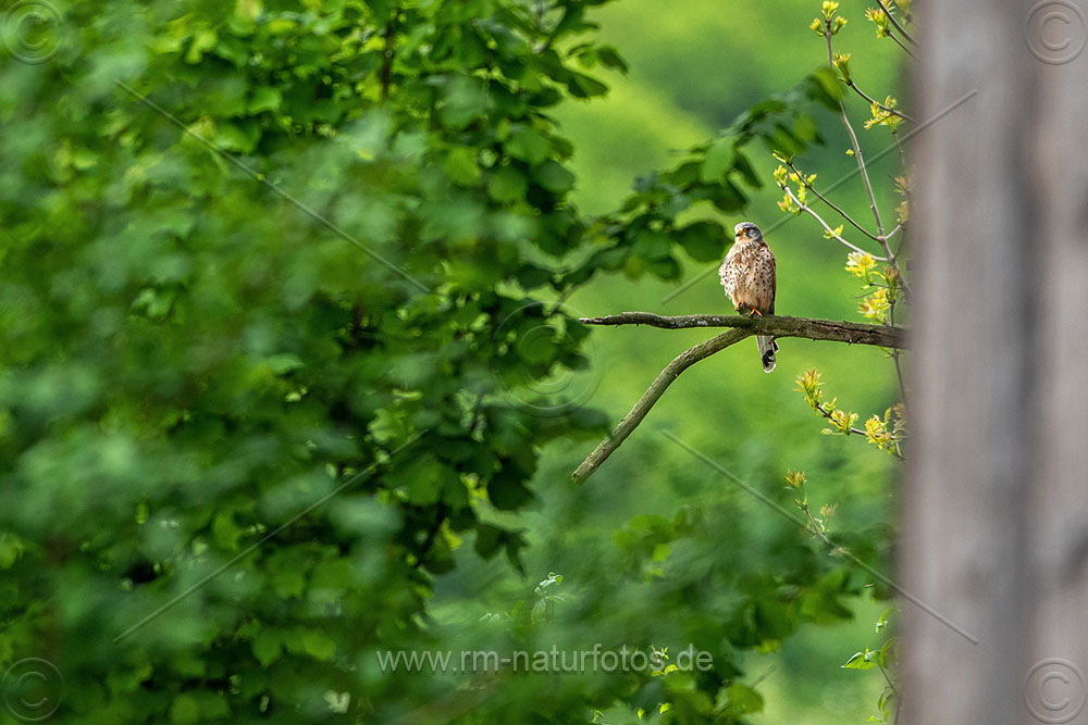 Turmfalke (Falco tinnunculus) Männchen am Ansitzast vor dem Nistkasten