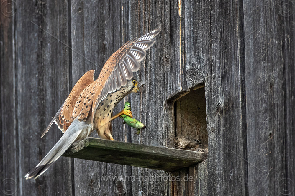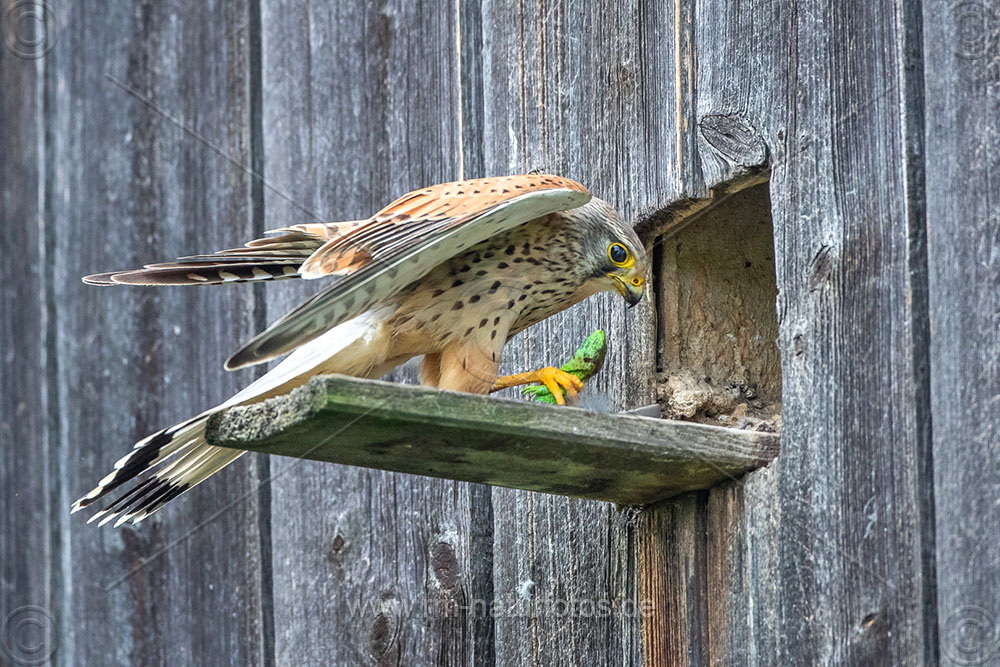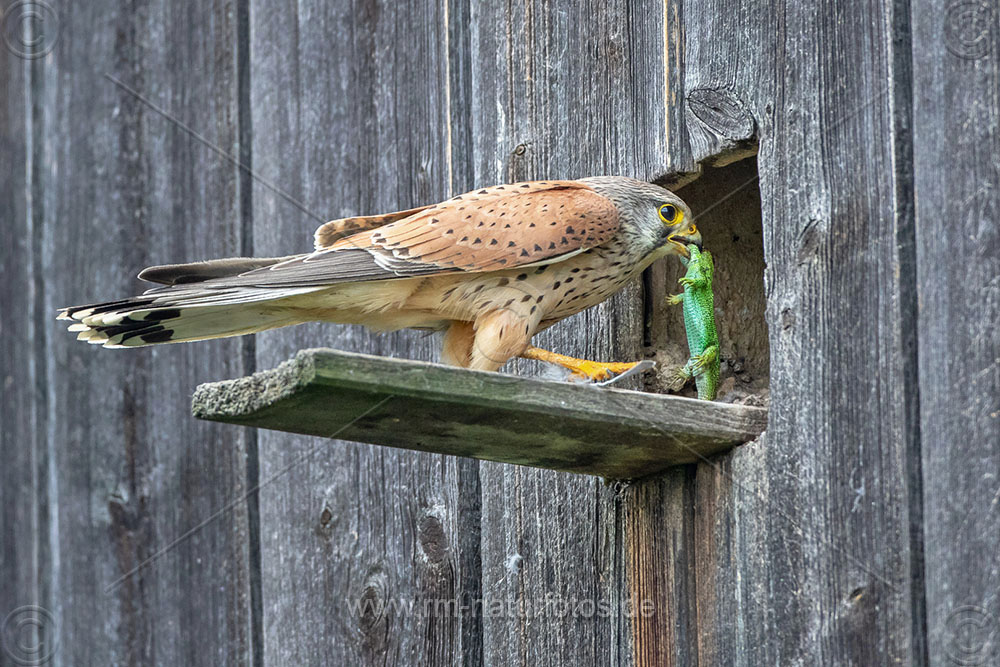 Turmfalke (Falco tinnunculus) Männchen mit Zauneidechse