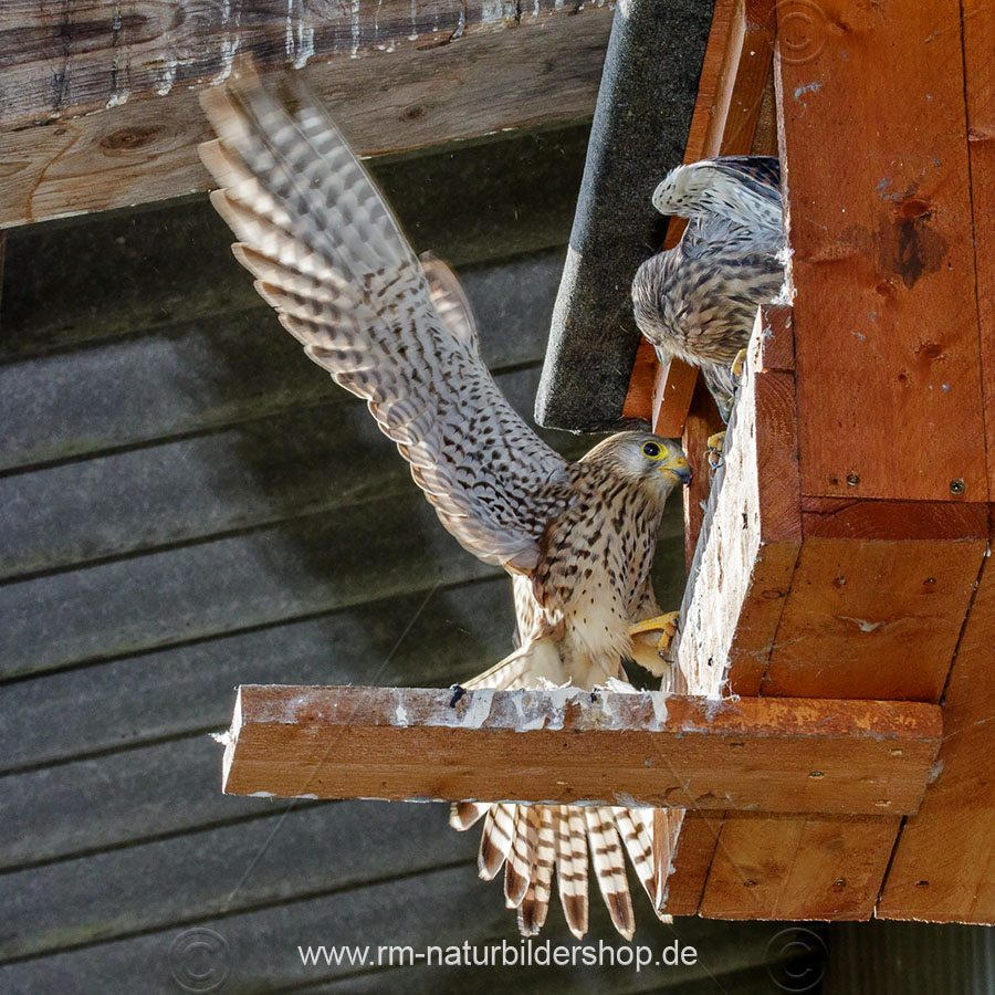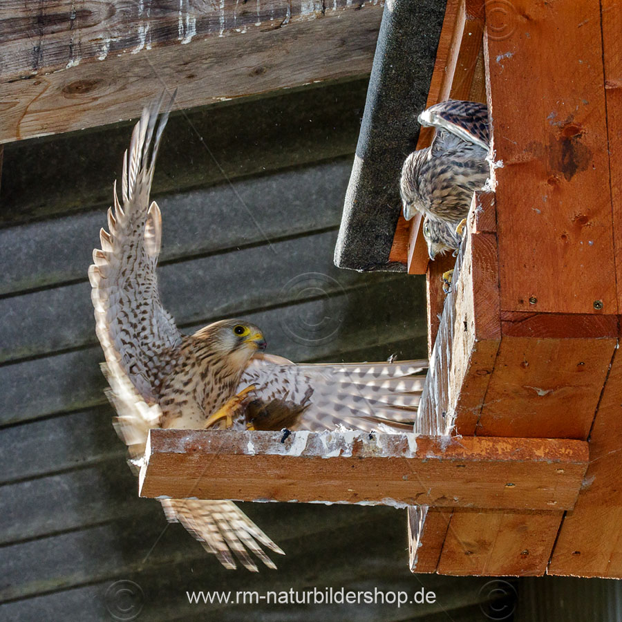 Turmfalke (Falco tinnunculus) manchmal wird es eng vor dem Kasten