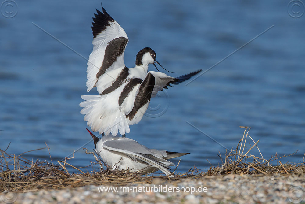 Säbelschnäbler (Recurvirostra avosetta) streitet mit Lachmöwe