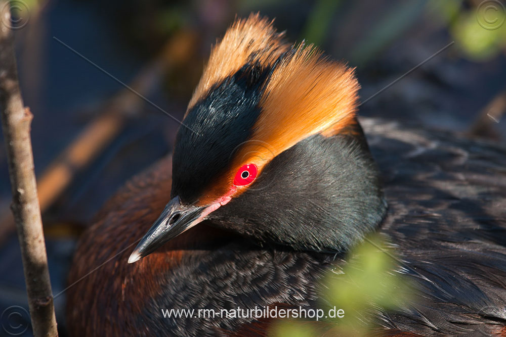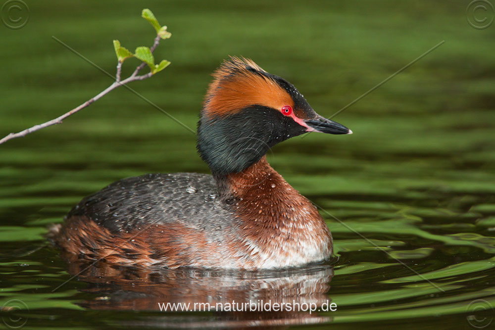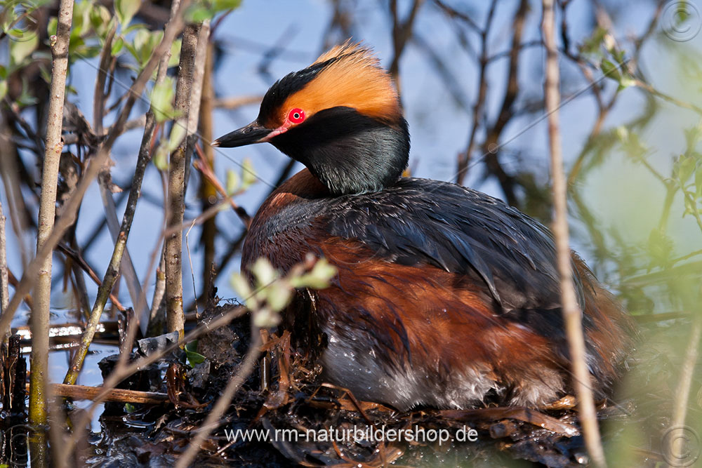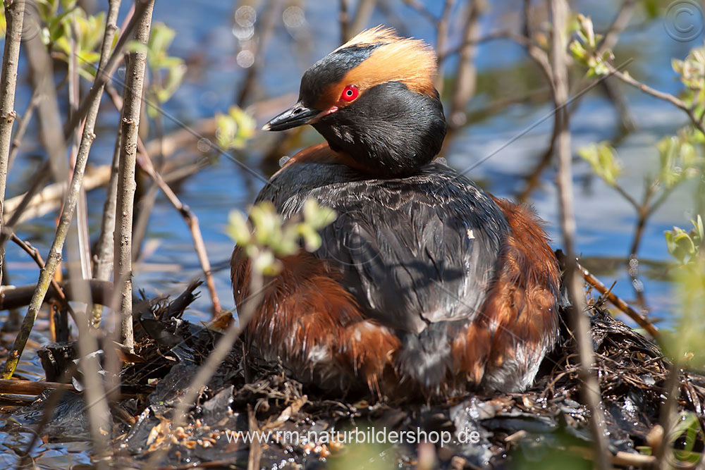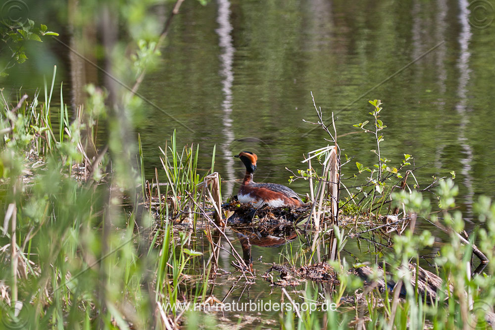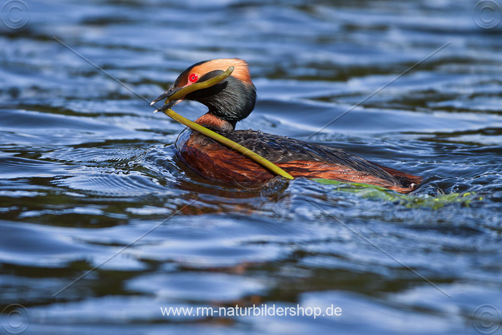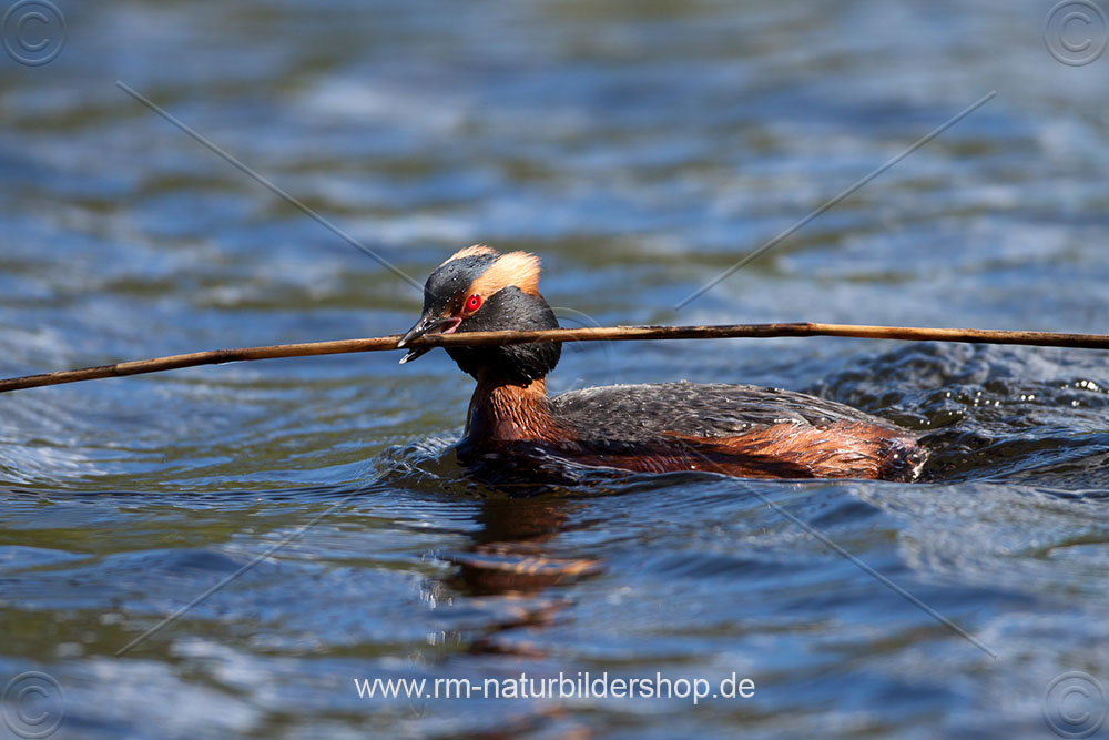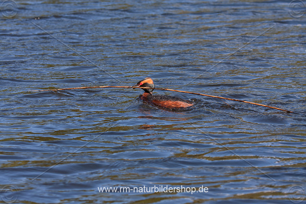 Ohrentaucher (Podiceps auritus) mit Nistmaterial