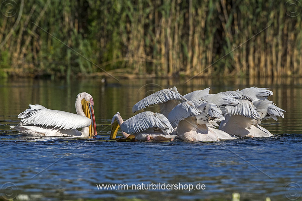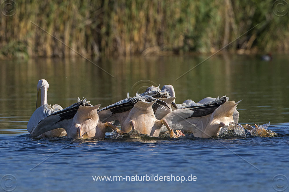 Rosapelikane (Pelecanus onocrotalus) beim Fischfang