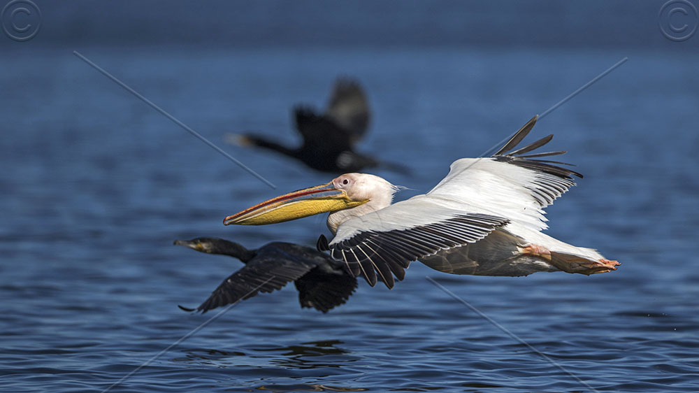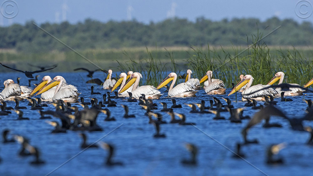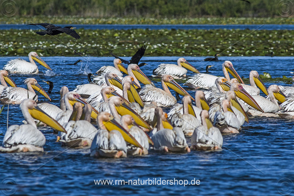 Rosapelikane (Pelecanus onocrotalus) und Kormorane