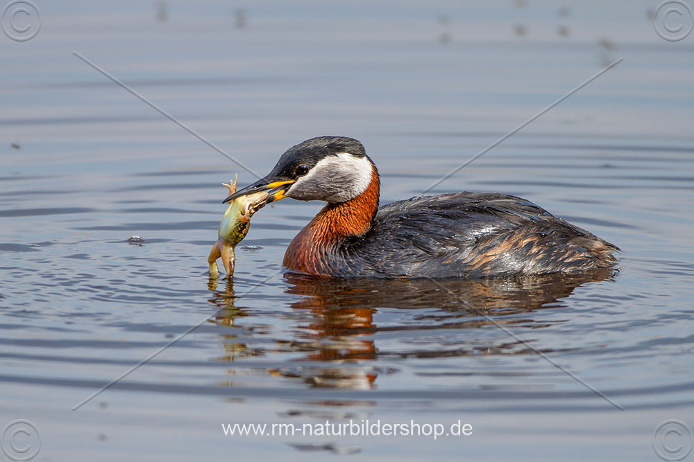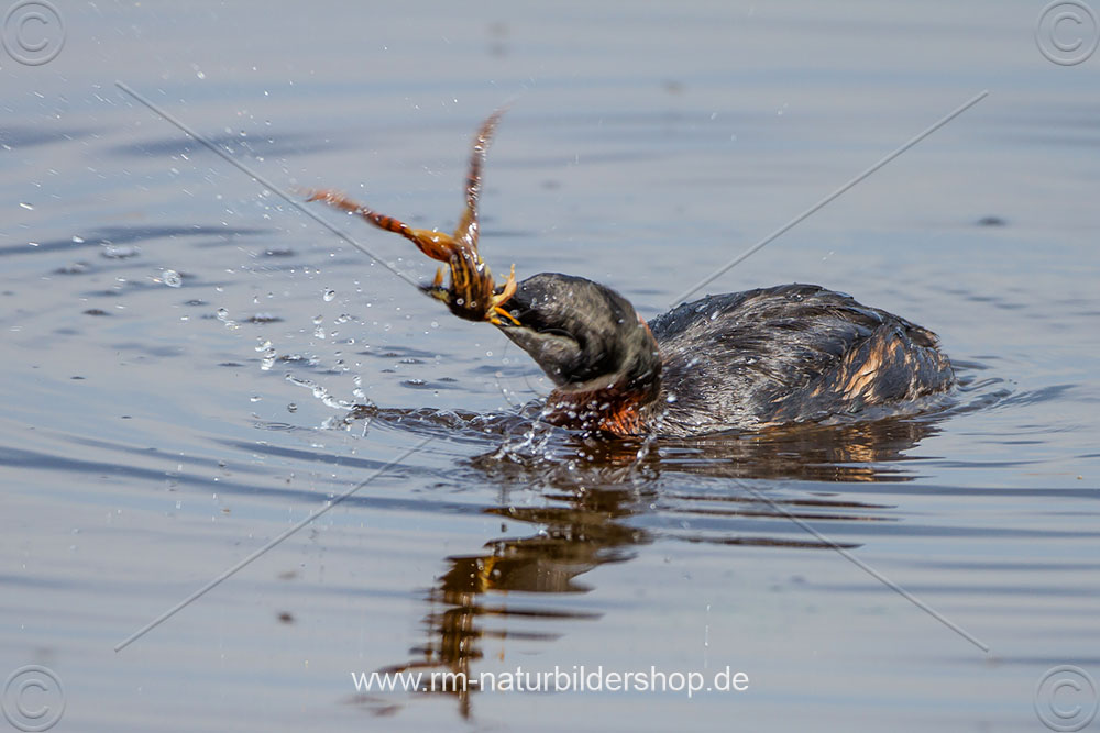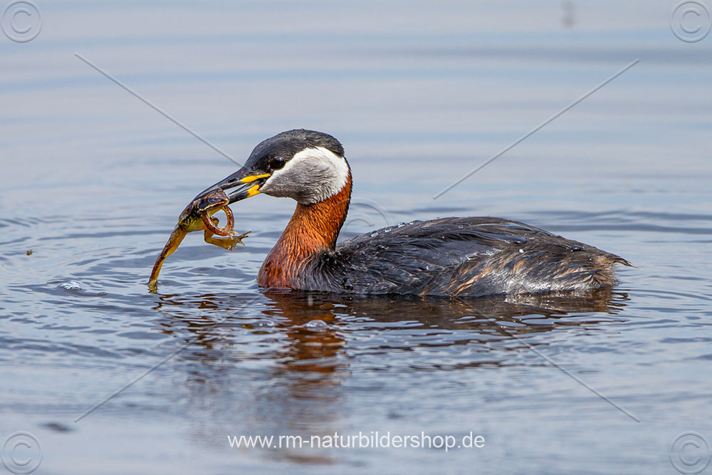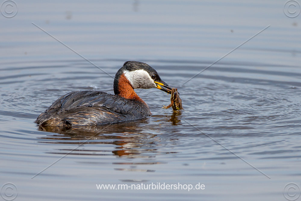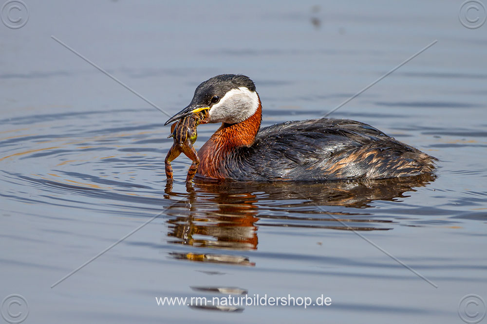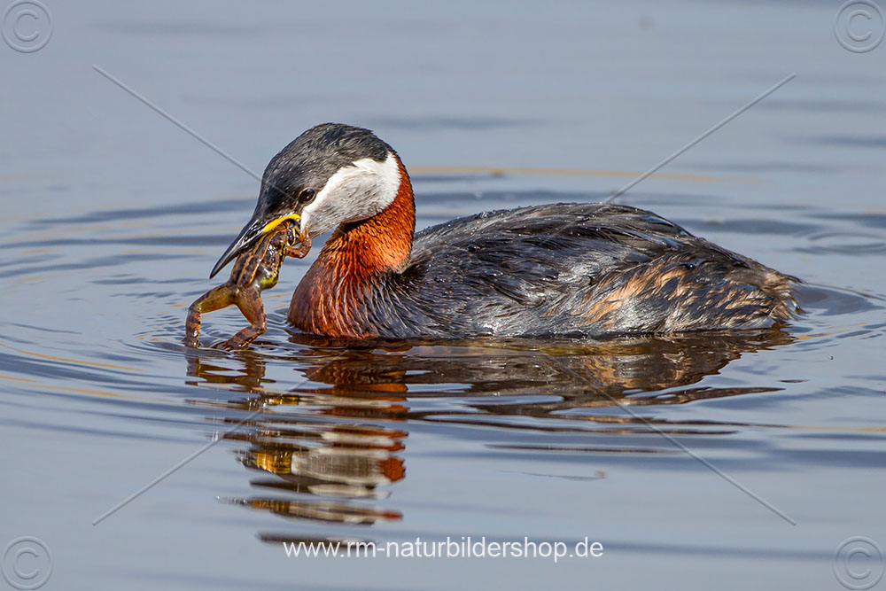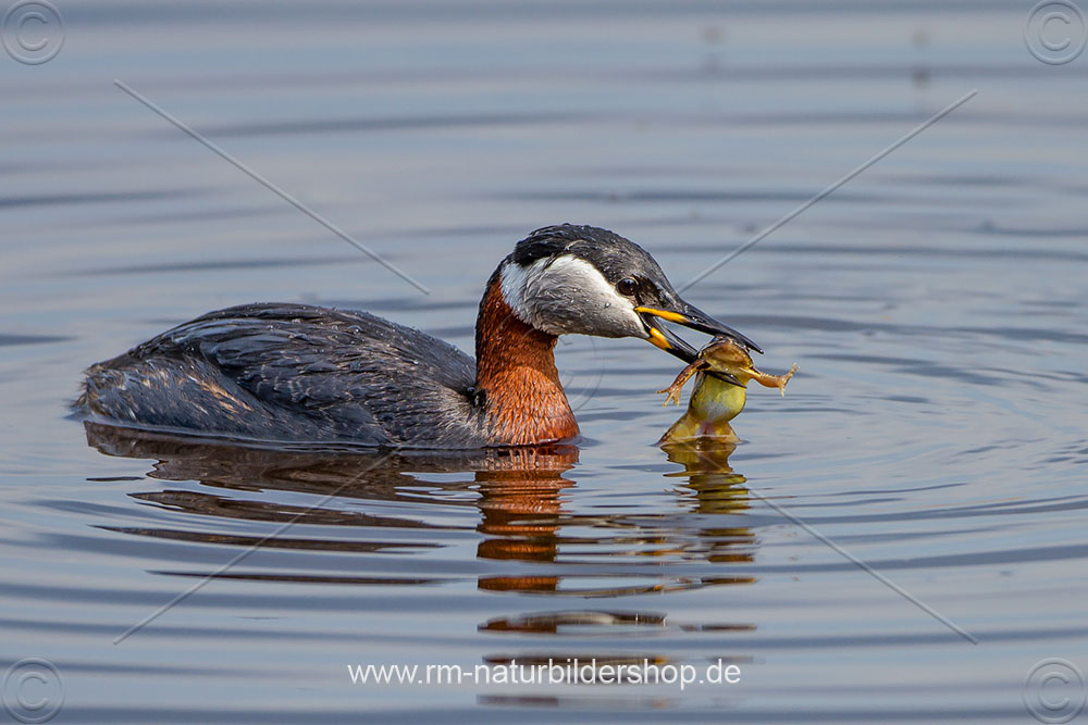 Rothalstaucher (Podiceps grisegena) mit Frosch als Beute