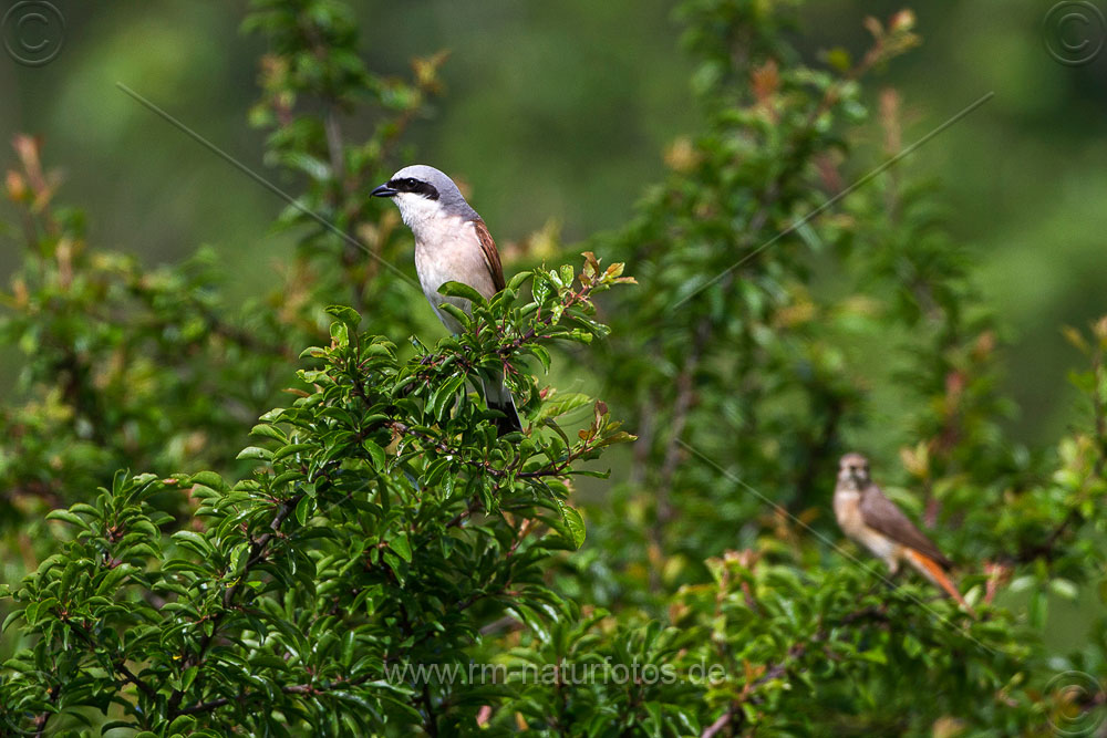 Neuntöter (Lanius collurio) Männchen und Gartenrotschwanz Weibchen