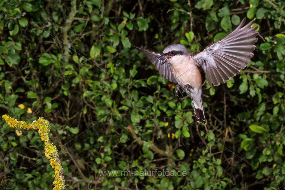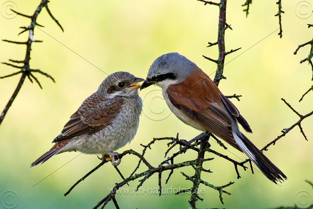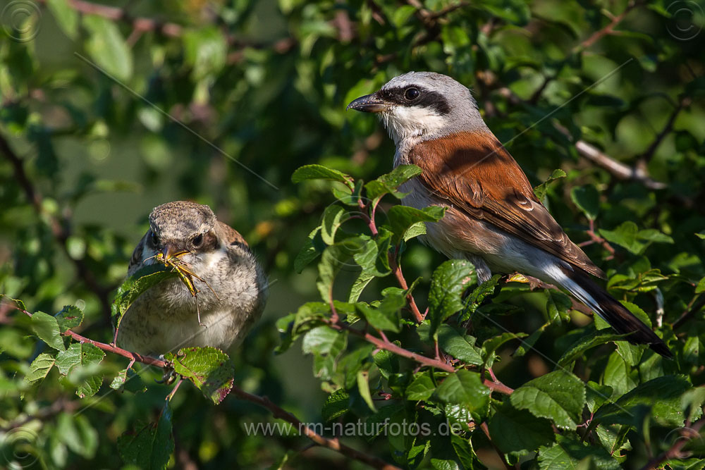 Neuntöter (Lanius collurio) Männchen füttert Jungvogel