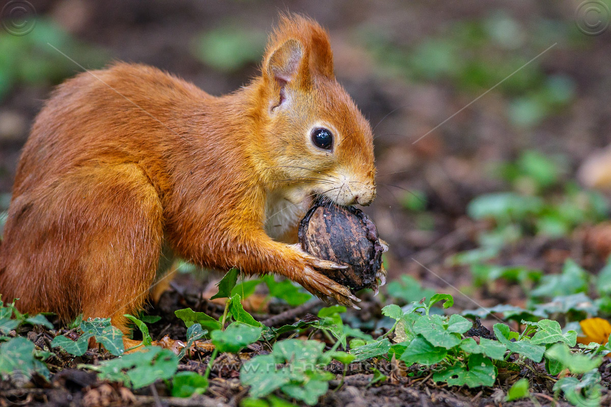 Eichhörnchen (Sciurus vulgaris) mit Walnuss