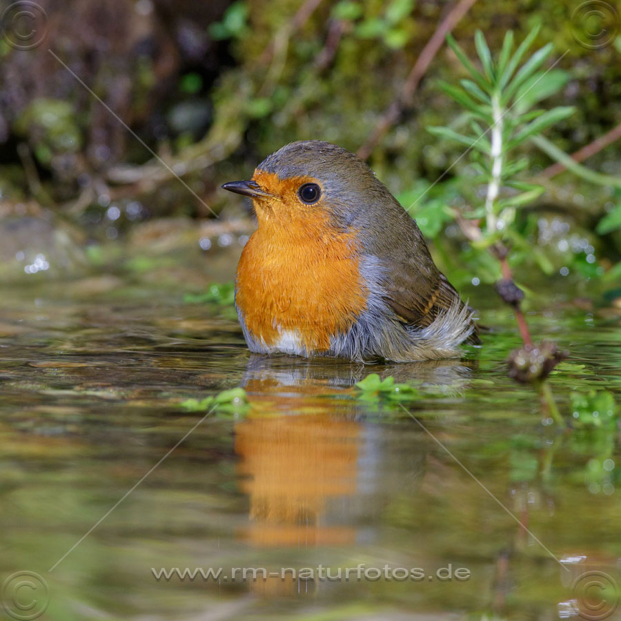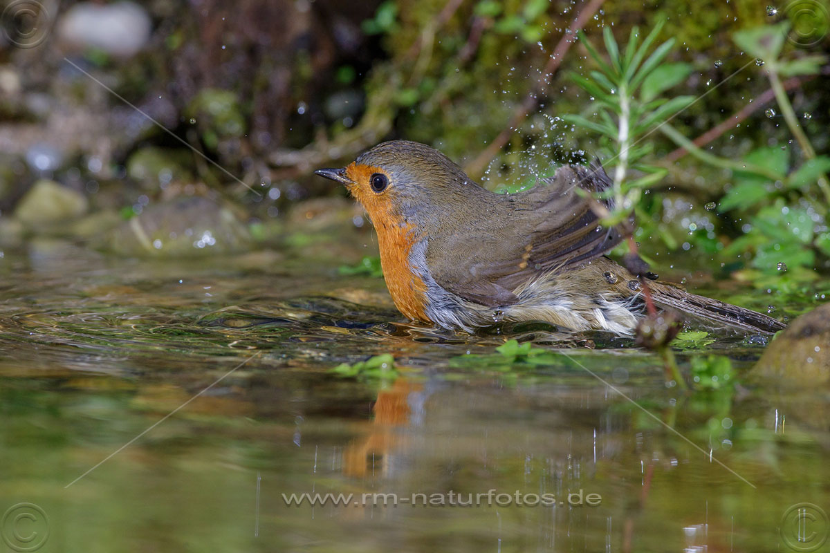 Rotkehlchen (Erithacus rubecula) badet