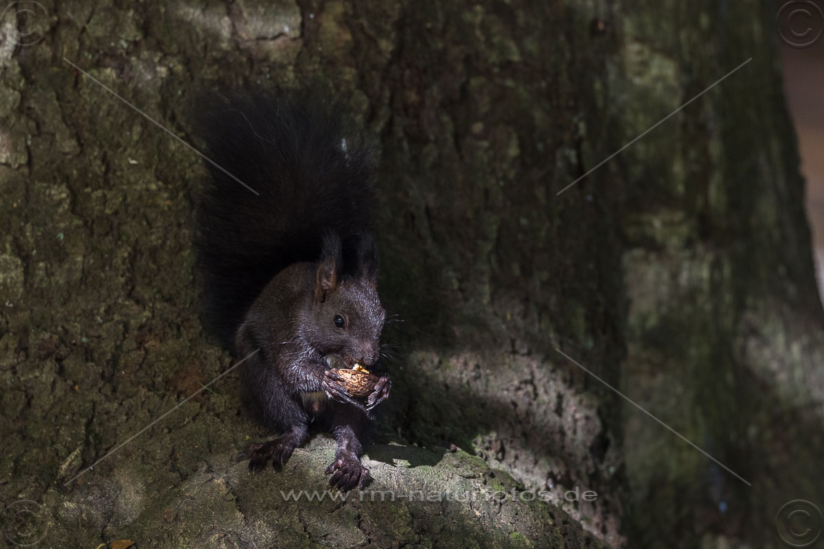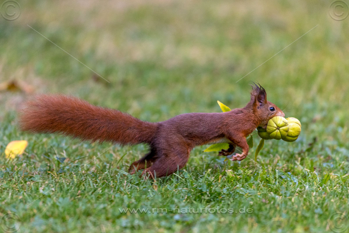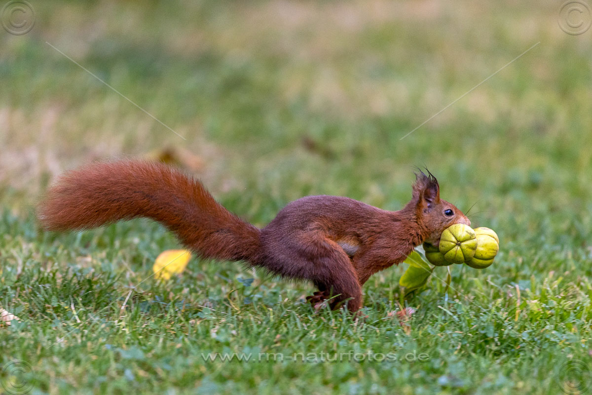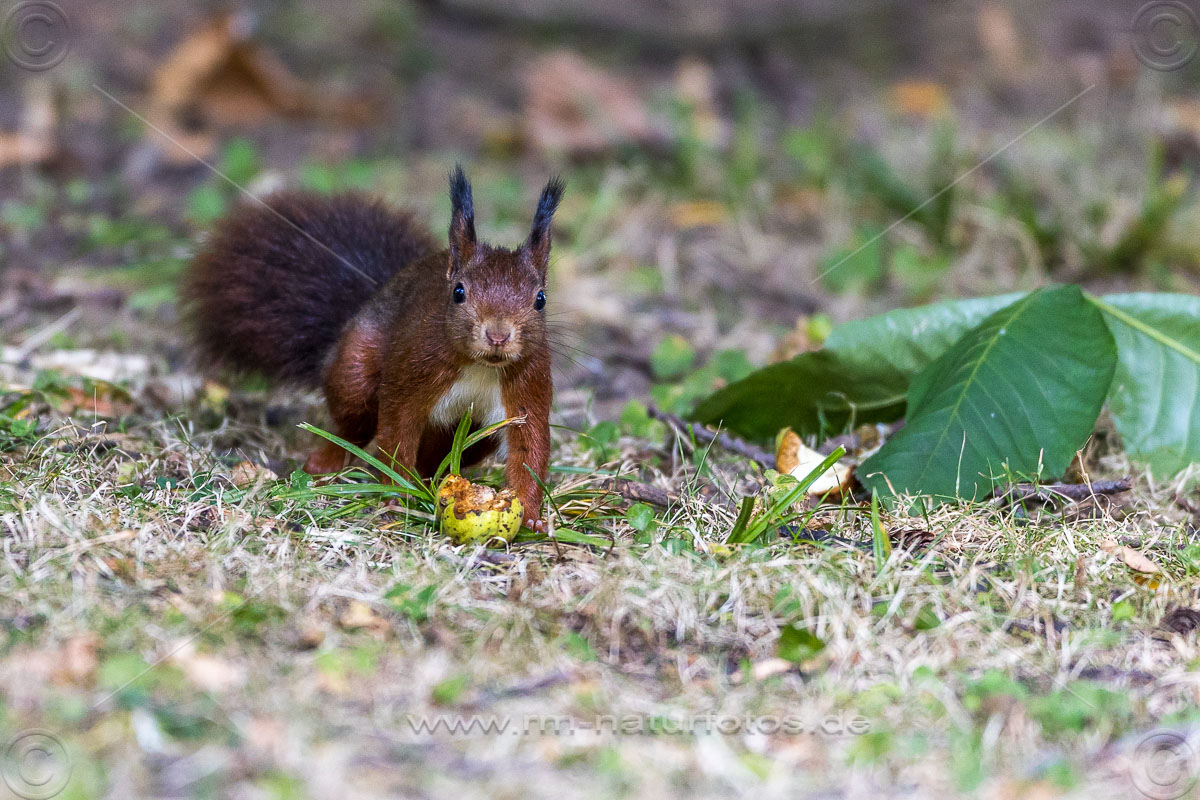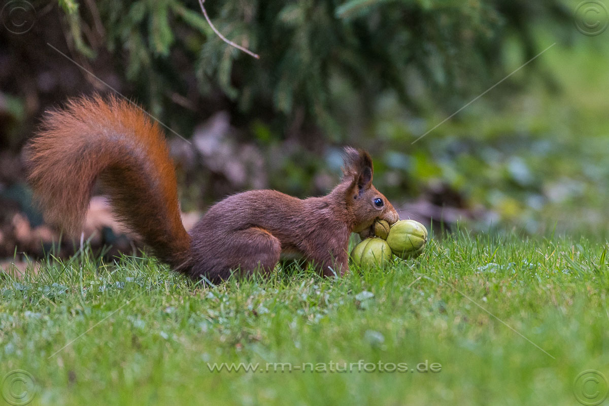 Eichhörnchen (Sciurus vulgaris) mit Hickorynüssen